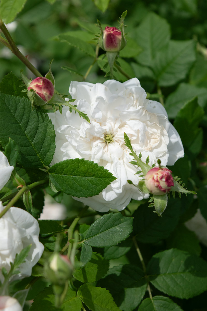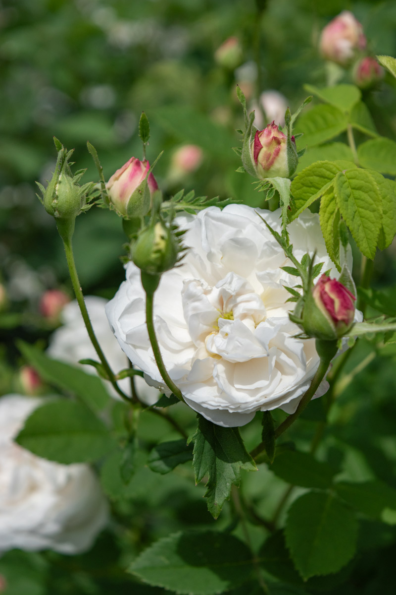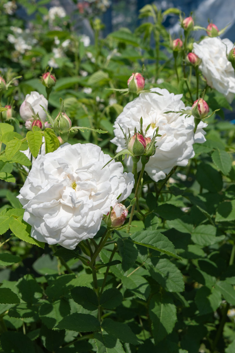 フルーティな香り。蕾はやや紅色を帯び、開くと純白のロゼット咲きの花が3~6花の房咲きとなります。まとまりのある樹形で枝は細くしなやかで扱いやすいです。トレリスやフェンスなどに誘引すると枝がよく伸び、半日陰でもOKな強健種です。オールドローズ好きにはたまらない、世界中で愛されている品種です。