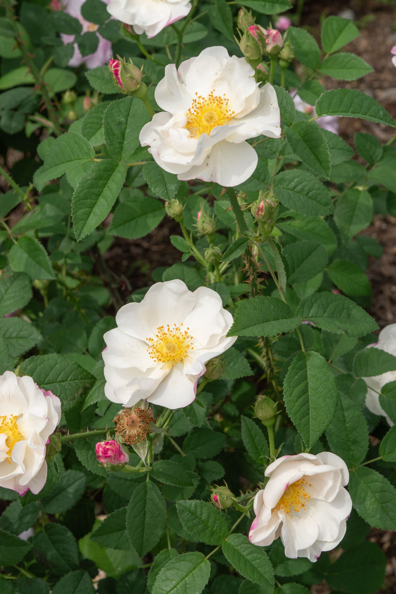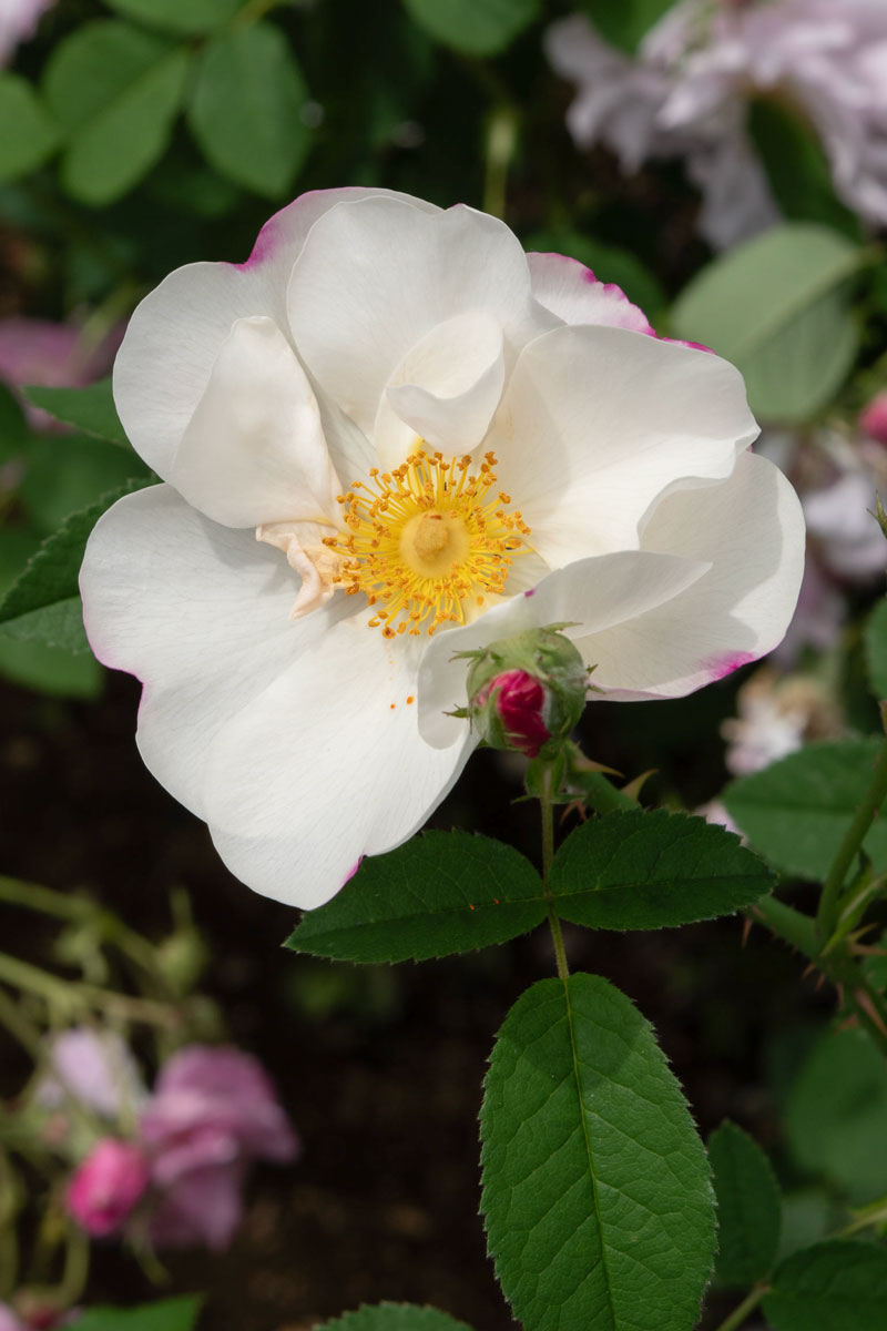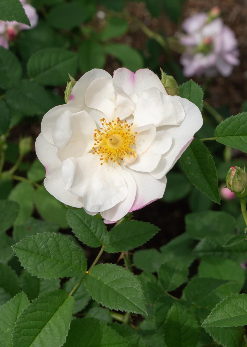 ロサ・ダマスケナとロサ・エグランテリアの交雑種とされています。縁に紅が入るクリーミーホワイトの半八重のカップ咲きで、大変可愛らしく、房咲きになって咲きます。