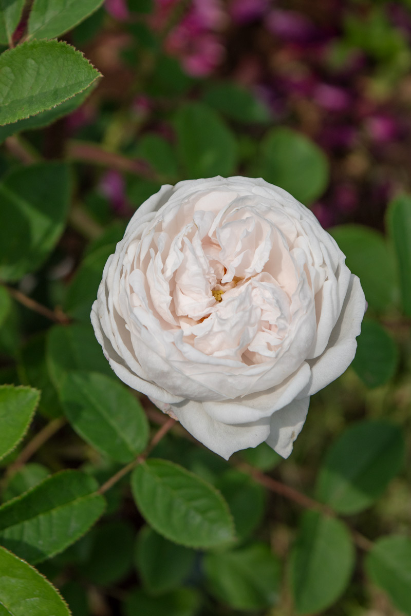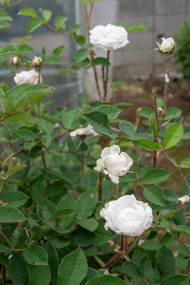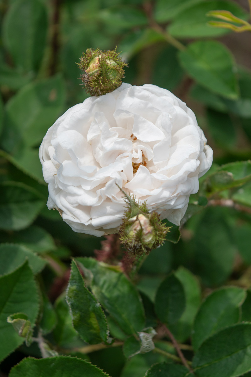 白い花は雨で痛みが出やすいものの、深い緑色の葉とのコントラストは素晴らしいものがあります。細長い茎は栗色のモスにびっしりと覆われます。