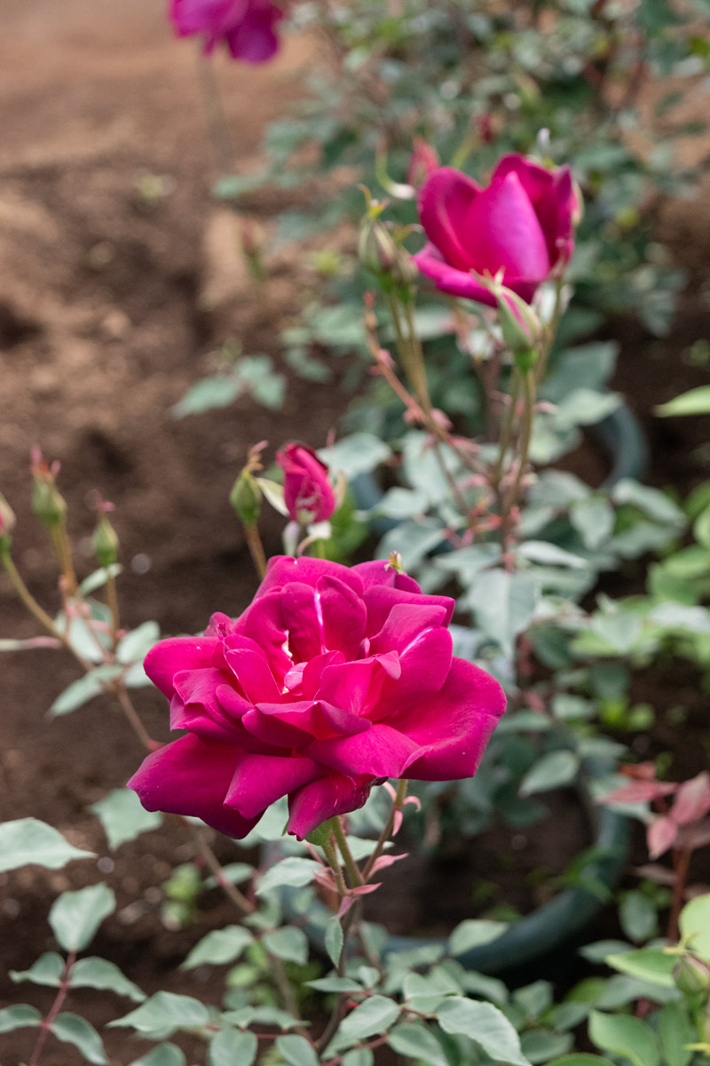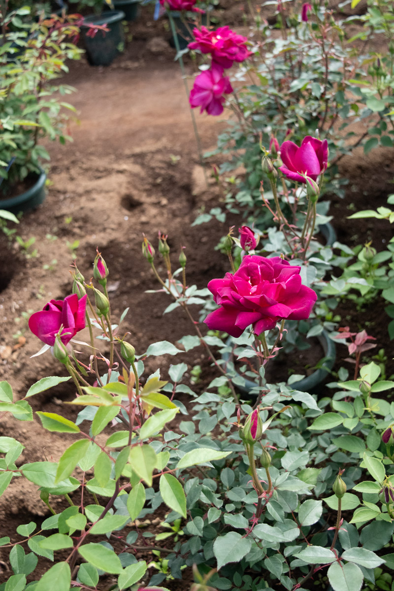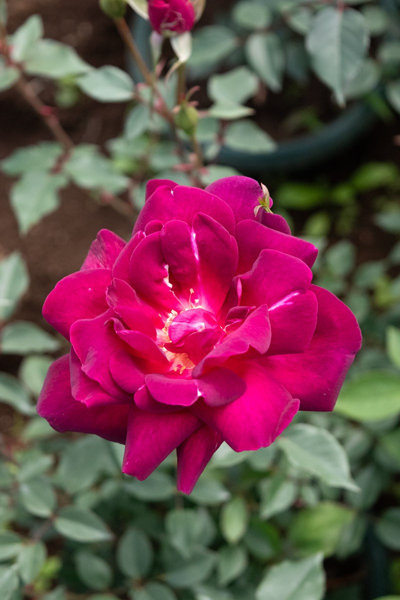中型のビロードがかった赤紫の地に、弁底が白みを帯び、チャイナ系の特徴をよく表した品種で、半直立でまとまり、花壇や鉢仕立てにも適します。
