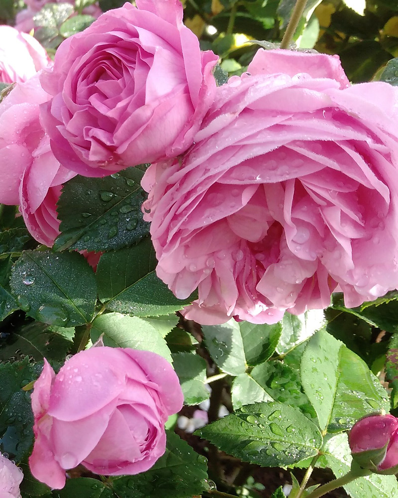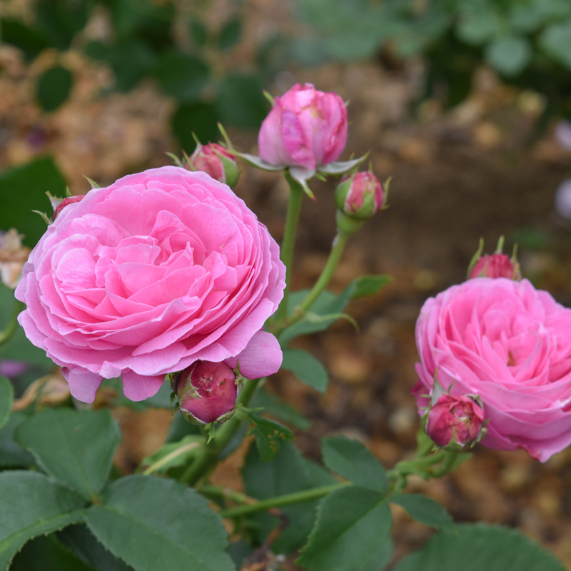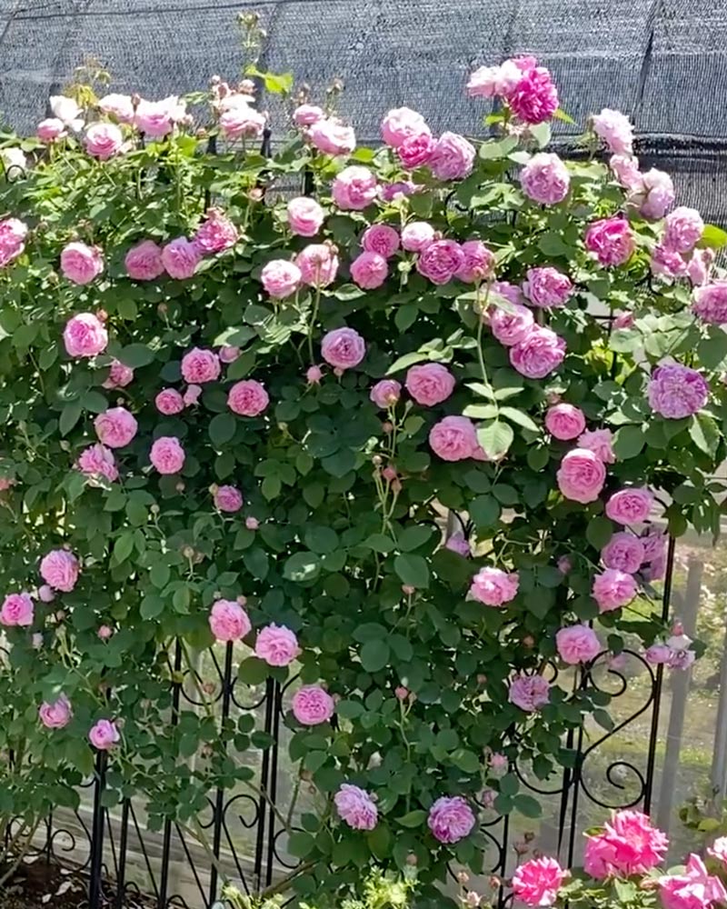 紫色を帯びたピンクで、浅いカップ咲きから、開くにつれクォーターロゼット咲きになります。整った花形で花数も多くよく香り、高い人気を誇る品種です。強健でシュートの発生がよく、しなやかな枝は誘引しやすく、アーチやフェンスに向いていますが、鉢でも育てられます。十分に成長するとたくさんの花を付けるので、シーズン中長く楽しめます。