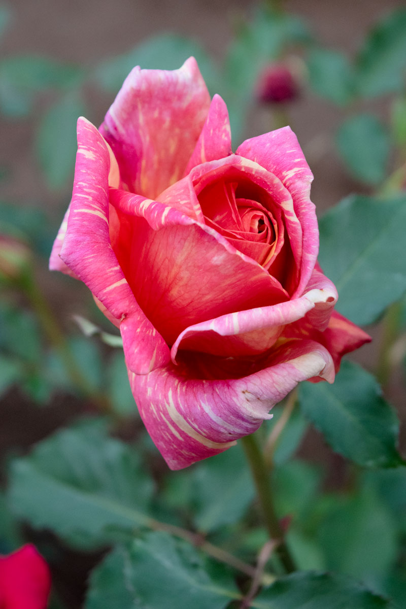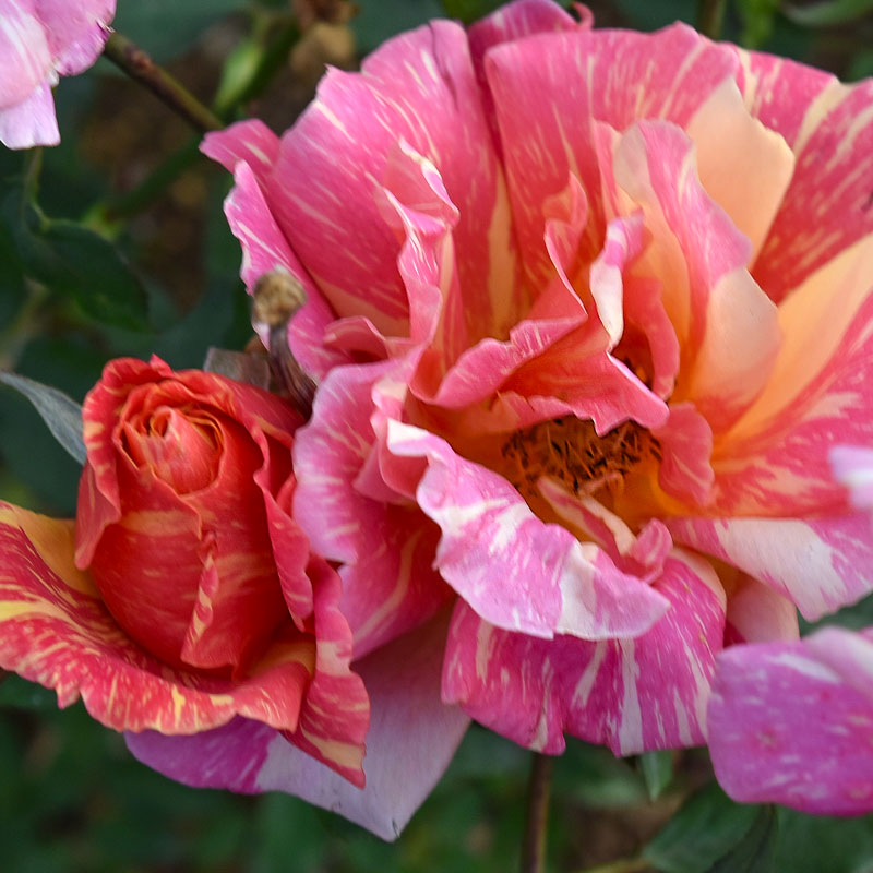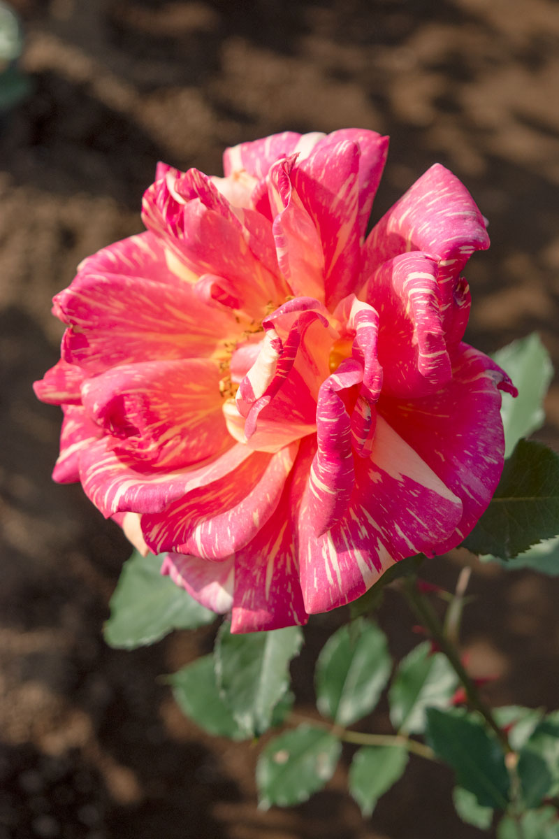別名アンビル・スパークス。明るいサーモンピンクと黄色の絞りはひときわ鮮やかです。一株あるだけで花壇を明るくしてくれる。香りは強く、フルーツを含むティー香です。耐病性には若干難があります。