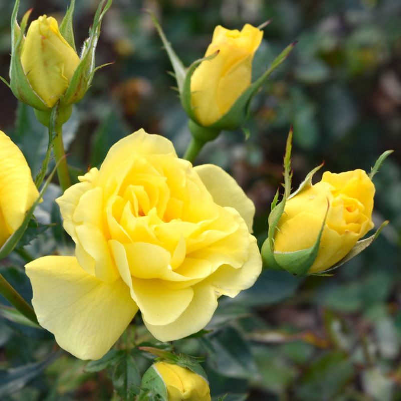 フロリバンダ系では珍しい芳香種で、モモやリンゴなどに例えられるような爽やかなフルーティーな香りです。鮮明な濃黄色で、散り際まで花の色は変化しないで美しい色を保ちます。葉は濃緑色で、鮮やかな黄色とのコントラストが美しいです。強健で半直立性のコンパクトな品種で、鉢植えにとても向いています。別名サンスプライト(SunSprite)