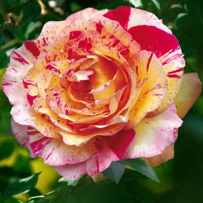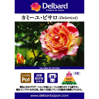 黄色と白、ピンクのグラデーションの地に、細かくルージュの絞りが入る。コントラストの強いひときわ鮮やかな花色。樹はコンパクトな木立性。鉢植えにも向く。