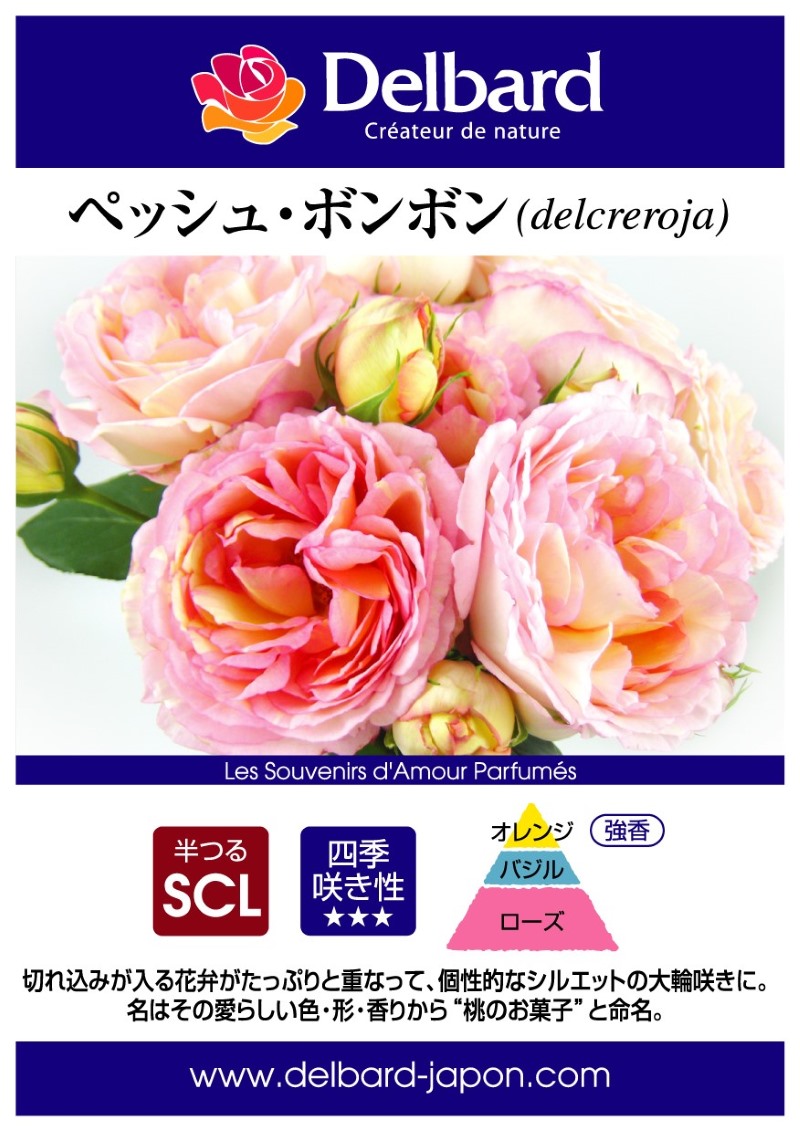 花名はその愛らしい色、形、香りからペッシュ=桃、ボンボン=お菓子、「桃のお菓子」の意味。
