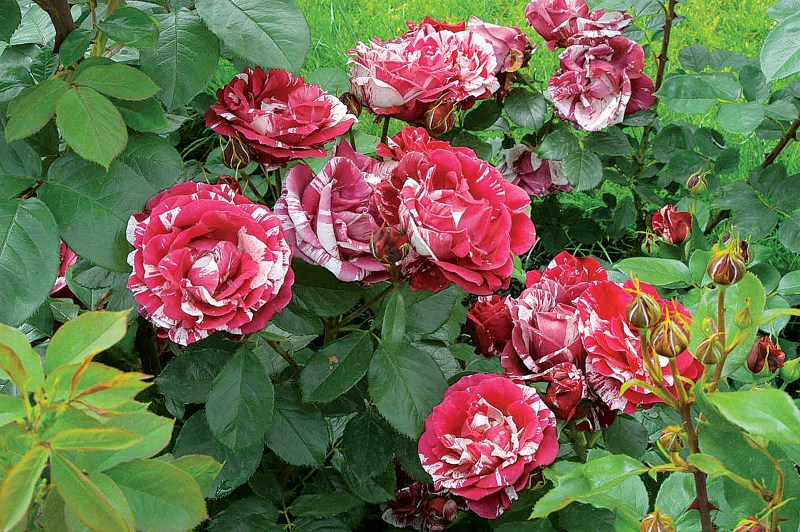 真紅と淡いピンクのコントラストがとても鮮やかな絞りの大輪花です。ローズとキイチゴの香りも印象的。花つきがとてもよく、四季咲き性に優れ、樹は非常に強健なしっかりとした木立性で鉢栽培にも向いています。