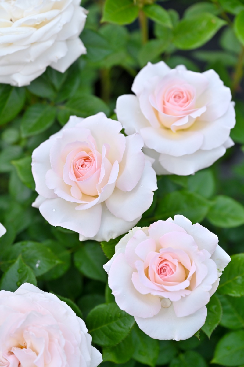 シルクのようなきめ細かな質感のクリームホワイトから、中心は淡いクリームピンクの大輪花。整った丸弁抱え咲きで、ときに花弁の縁に切れ込みが入ることもあります。花は大輪で単花咲きが多いが、充実した枝は3~4輪ほどの房咲きになります。