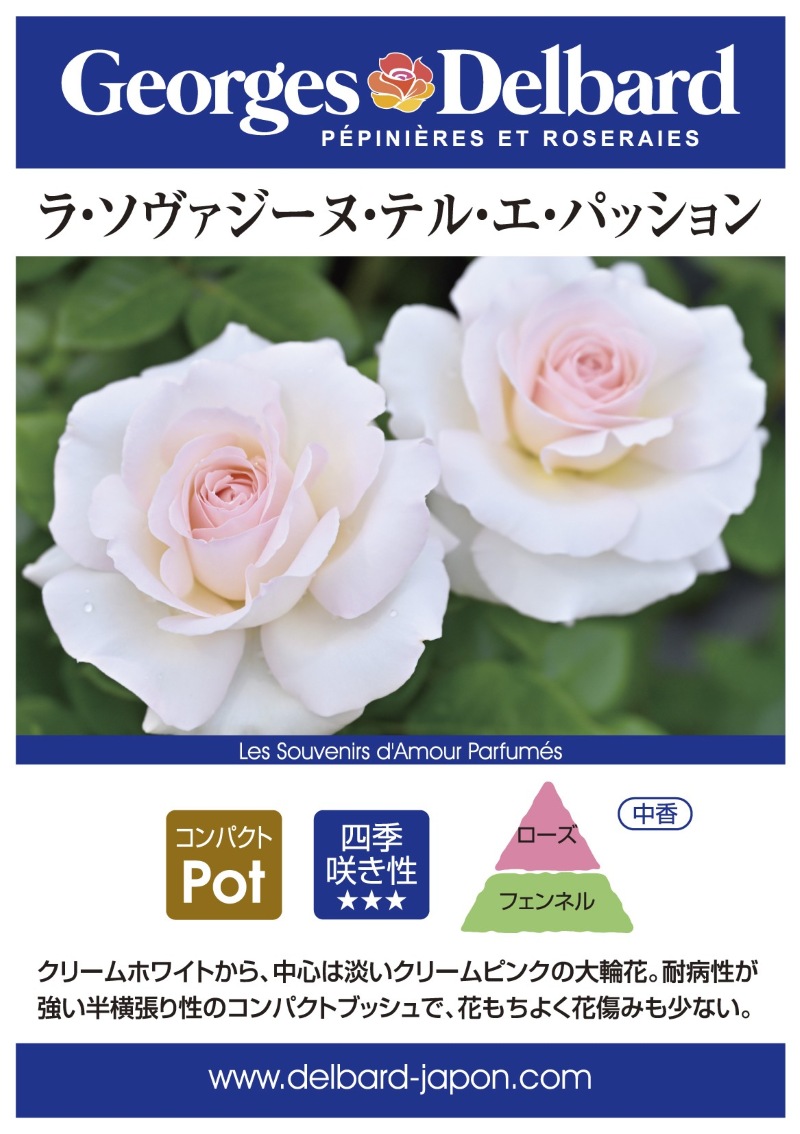 香りはローズを中心にフェンネルが混ざる中香です。耐病性が強い半横張り性のコンパクトブッシュで、樹勢が強く育てやすいです。枝の茂りと、花付きがとても良く、春には株いっぱいの大輪花を咲かせてくれます。花もちがよく花傷みも少ないです。夏から秋も枝が暴れることなくコンパクトな樹形を保ち、四季咲き性も抜群。