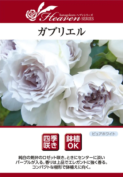 香りは上品でエレガントに強く香ります。大天使の名を持つ神秘的なバラです。花の中心は淡くパープルがかり、天使の羽根のような花びらがふわりとひらいてゆきます。優しさに満ち溢れる甘い香りは、心に安らぎを与えてくれます。