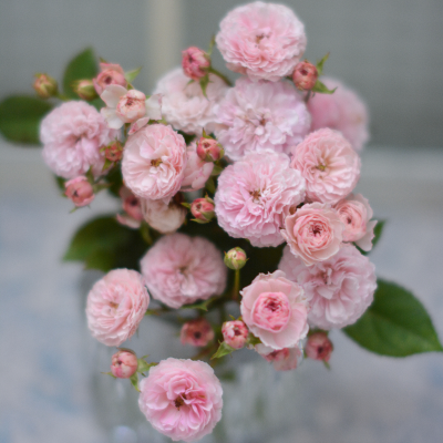 小さな可愛い花が房で咲き、とても可憐な雰囲気のバラ。コンパクトな横張りの樹形で他の草花と合わせて植えても相性がよく、一緒に切り花にしてアレンジするのもおすすめです。
