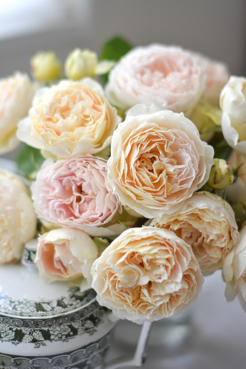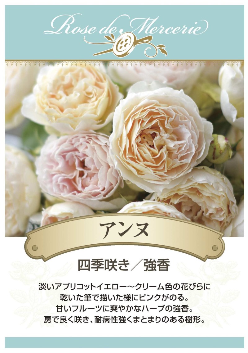 甘いフルーツに爽やかなハーブの強香。淡いアプリコットイエロー~クリーム色の花びらに乾いた筆で描いた様にピンクがのる。 房で良く咲いて、耐病性は強くまとまりのある樹形。