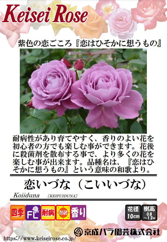 品種名は、紫色が恋ごころを表した「恋はひそかに想うもの」という意味の和歌より。