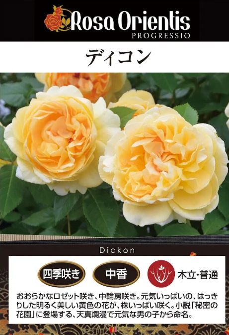 黄色、おおらかなロゼット咲き、中輪房咲きの花。ティの中香。元気いっぱいの、はっきりした明るく美しい黄色の花が、株いっぱい咲く。充実した枝以外は、単花咲きになりやすい。