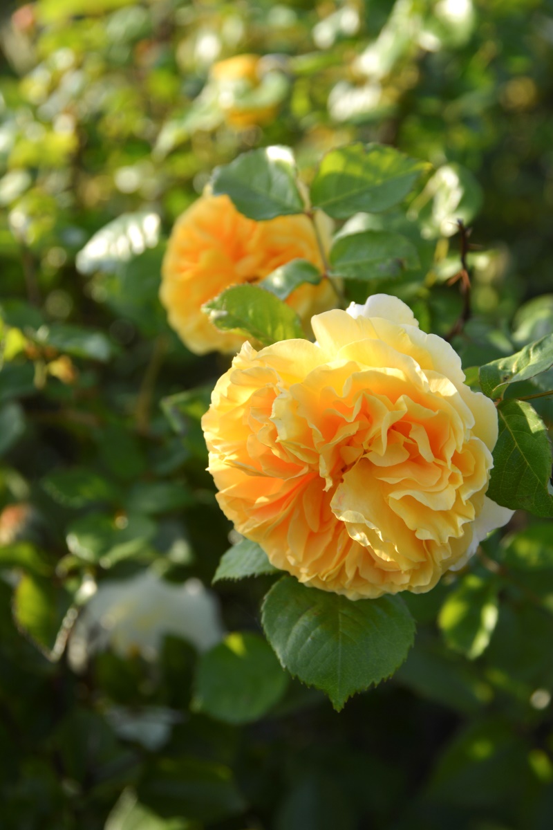 緩やかなロゼット咲きでオレンジがかる明るく鮮やかな黄色、中輪房咲きの花です。