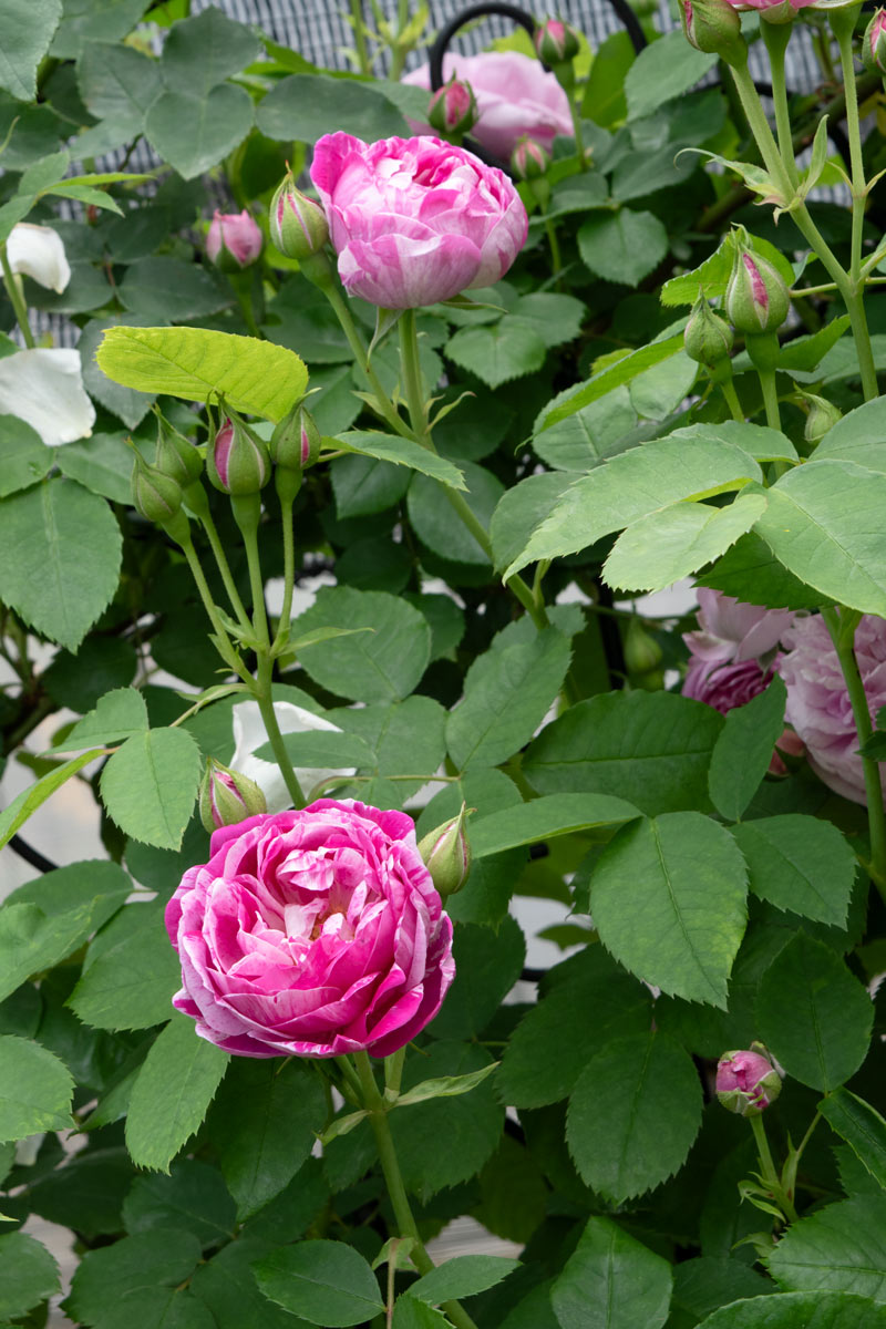 とても甘いラズベリーに似た香りです。桃色地にパープルの縞模様の入る大輪で、花弁数20枚前後のカップ咲きです。トゲが少なく樹高は2mぐらいまで伸びるので誘引をして仕立てることにも向いています。