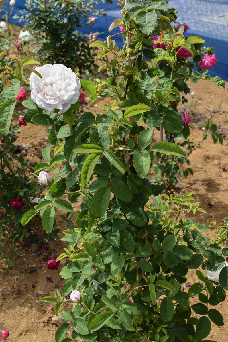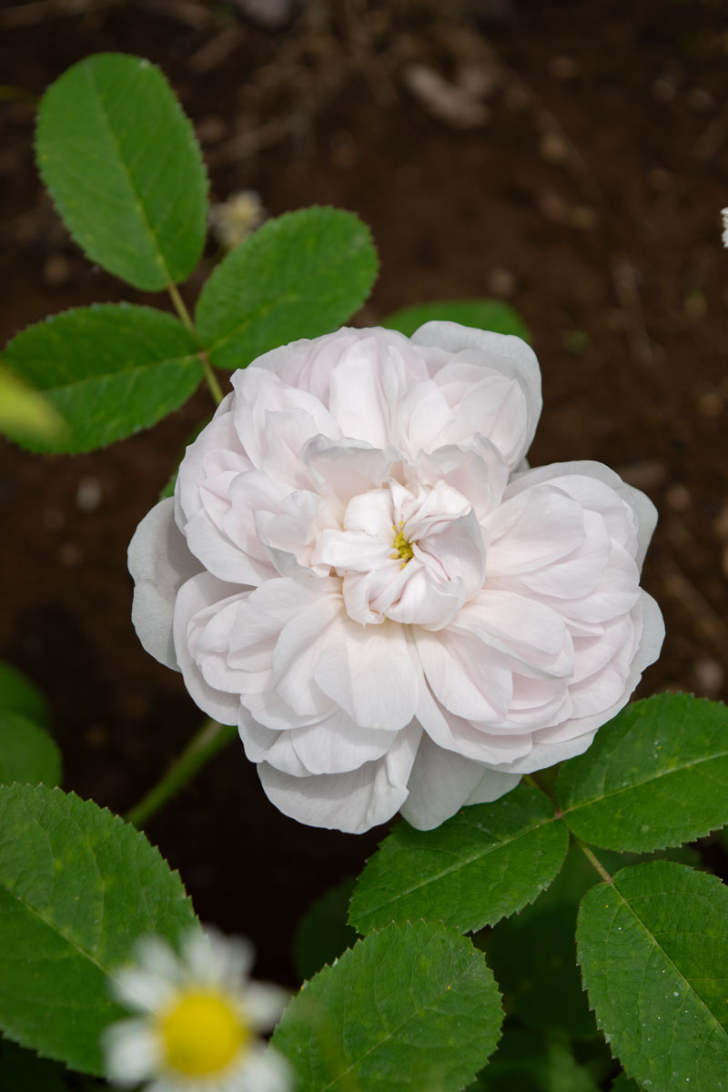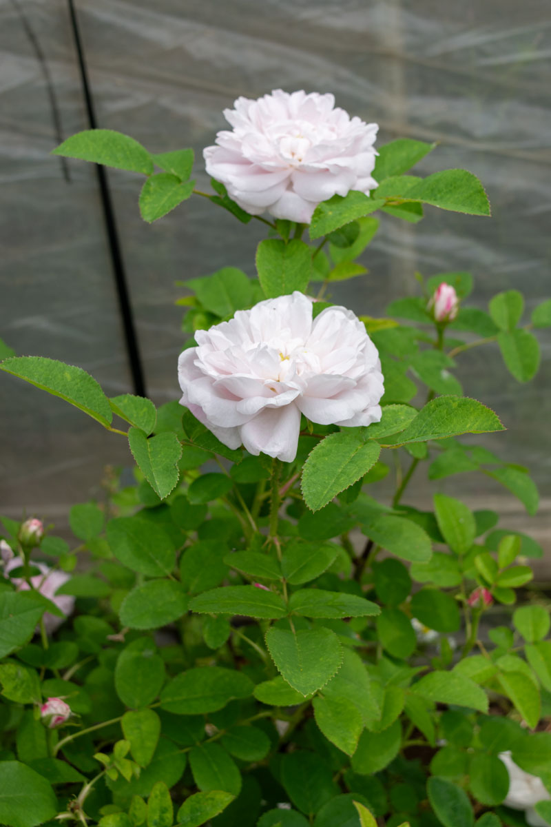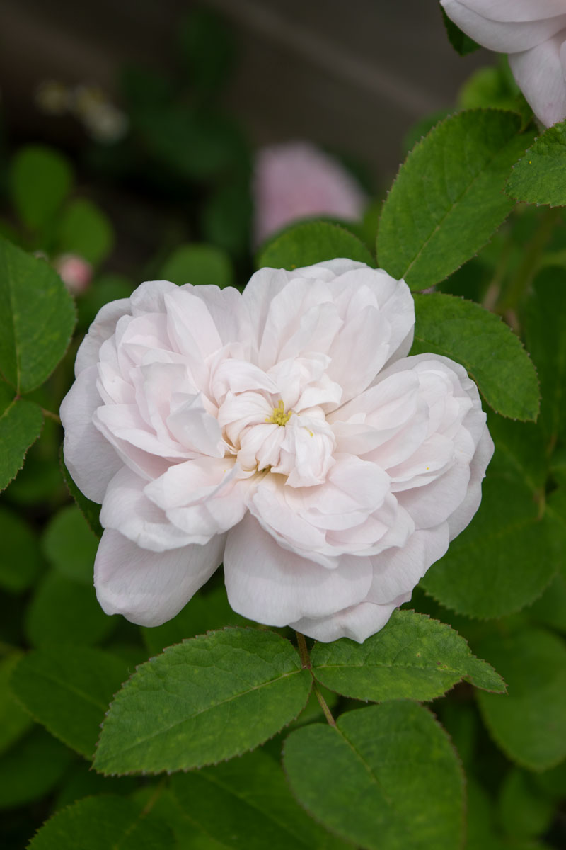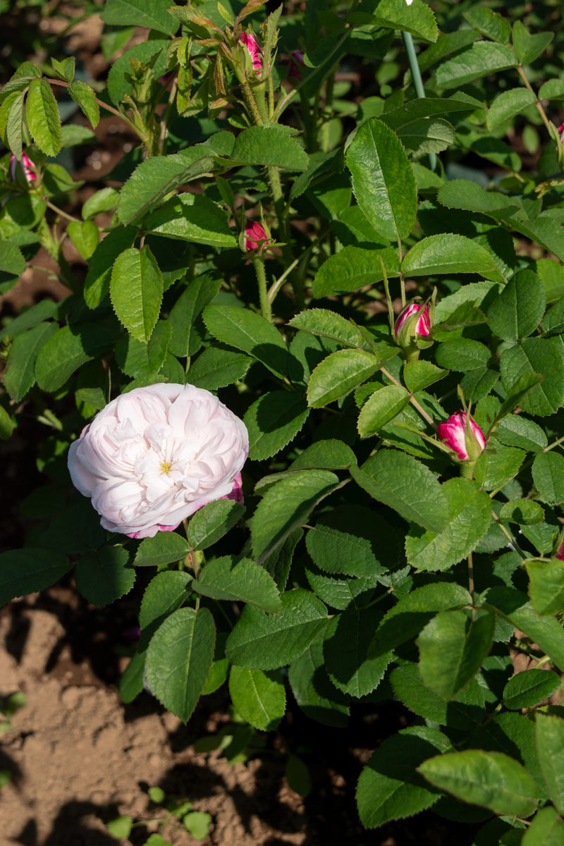 白地に薄くかかる紅色が美しいクォーターロゼット咲きの品種です。芸術的な美しさを持ち、マダムアルディによく似ていますが、花付きよく柔らかな印象です。トレリス・アーチに最適です。