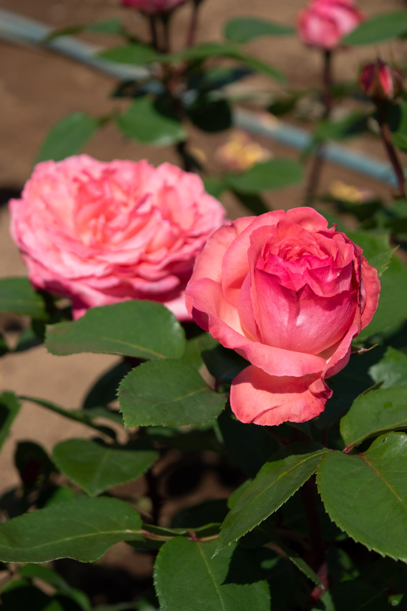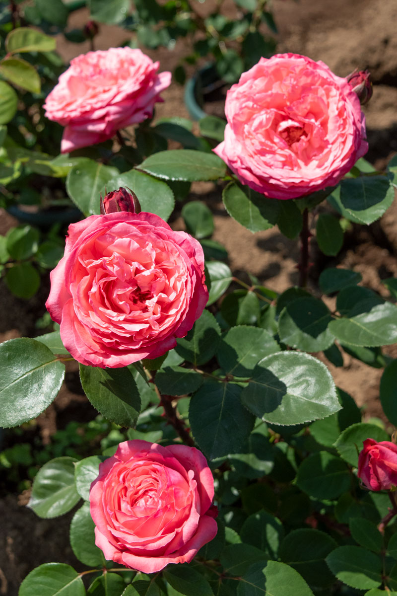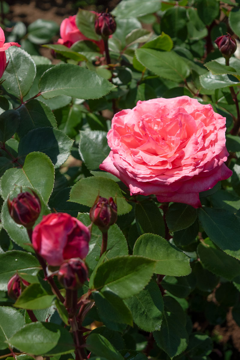 明るいサーモンピンクが一際目を引く品種です。株立ちは素晴らしく、高性の大株に生育していきます。特に黒点病に対して耐性があり、育てやすく初心者向きになります。1981年ハーグ国際コンクール金賞、ほか多数の国際コンクールで受賞。別名メイカピナル。枝は半つる性によく伸びますので、秋花を楽しむために夏剪定をしてください。
