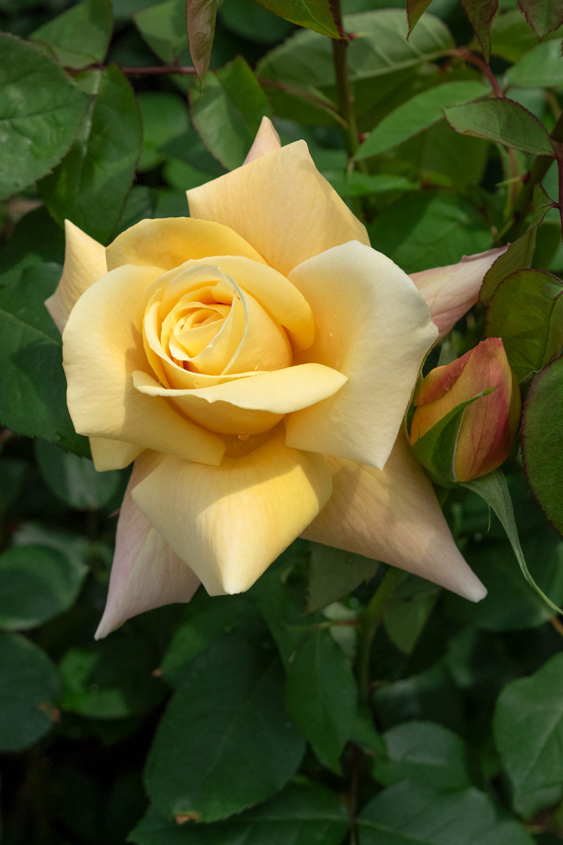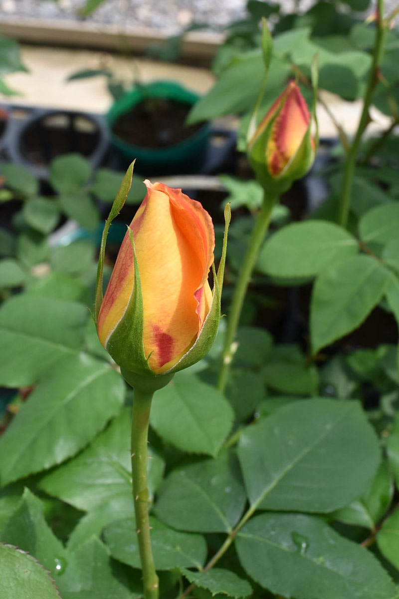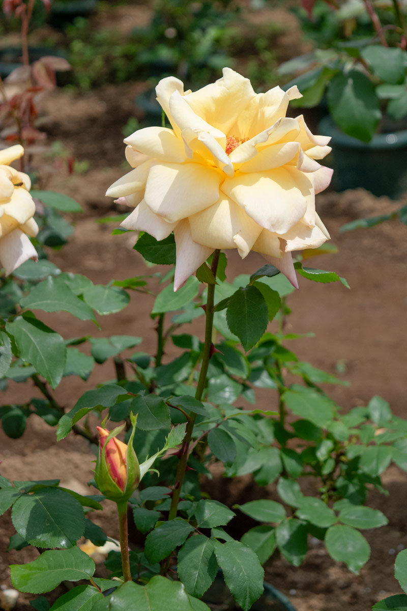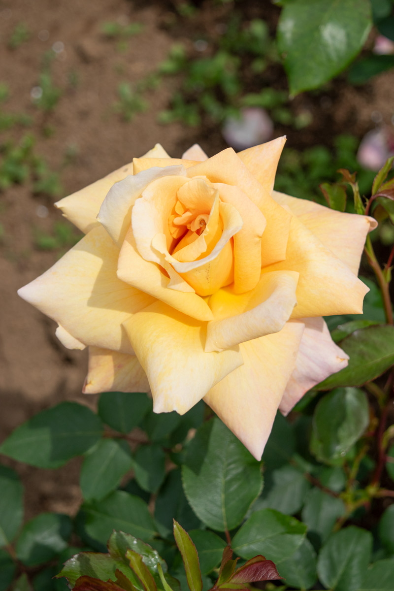ピース直系のバラ。ピースより濃いトーンのイエローをベース色に、アプリコットオレンジのぼかしが入ります。大輪の整った花形が美しく、切り花に最適です。甘いティー香もあります。