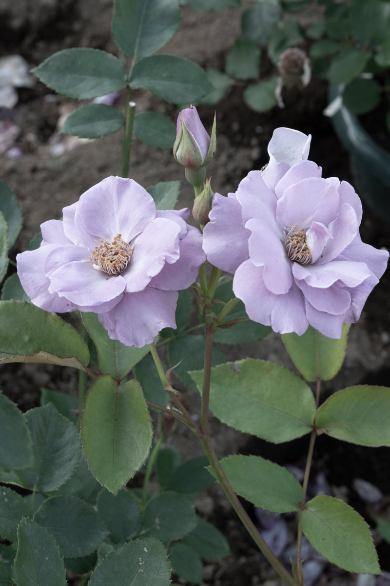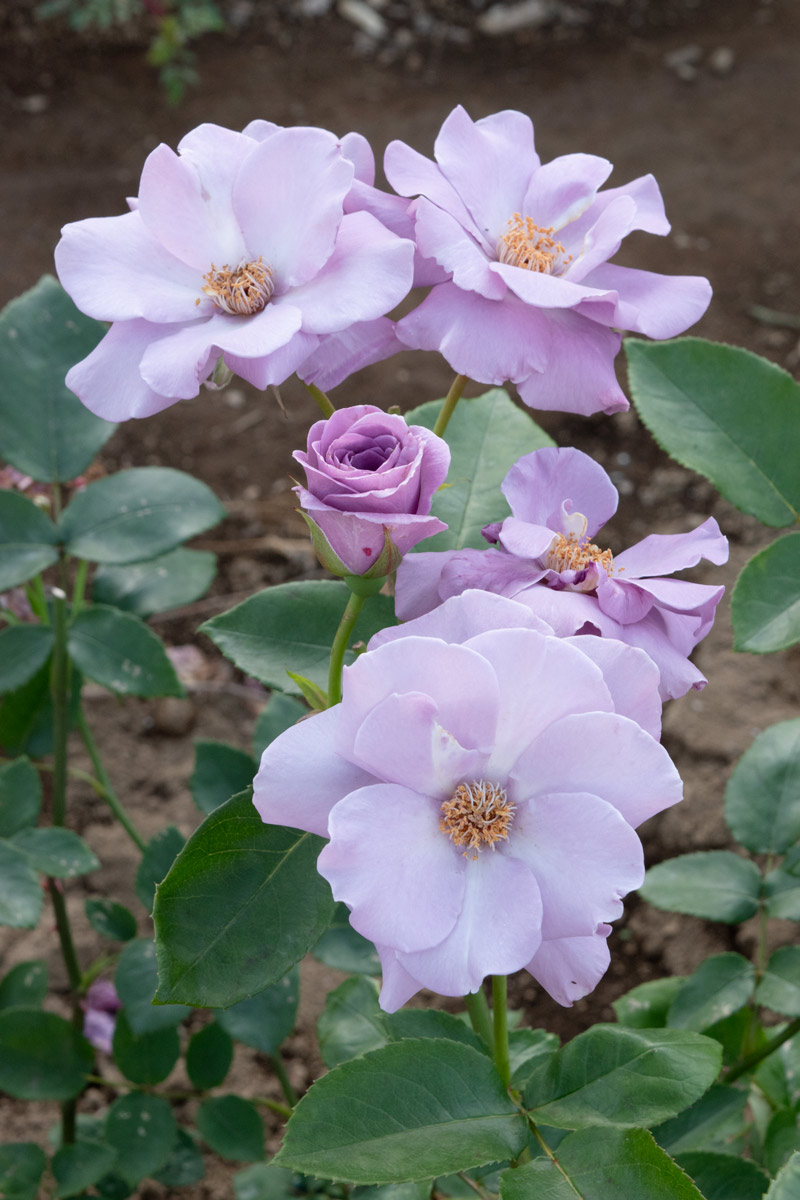 濃いラベンダー色の半八重咲きで花弁の縁は軽く波打ち、黄色のおしべも魅力です。大房になって開花し満開時は圧巻です。栃木県の育種家、小林森治氏の作出。遺伝子の組み換えではなく、長年根気強く純粋な交配を繰り返し、青バラの名花を多数生み出しました。日本生まれの青バラの一つです。交配親はグレッチャーと、スターリングシルバー。日本バラ会国際ばら新品種コンクール銅賞受賞。2019年NHK趣味の園芸で、「世界がときめく にっぽんのバラ」で紹介されました。