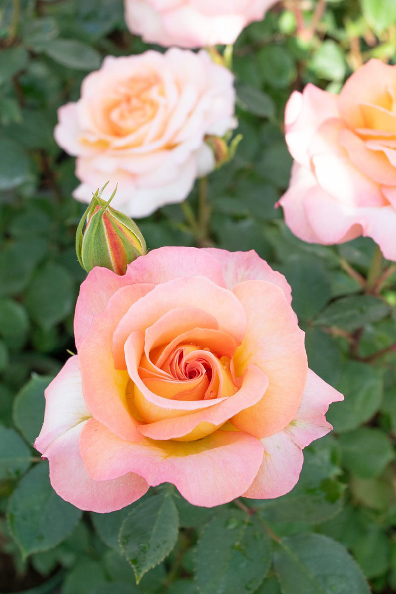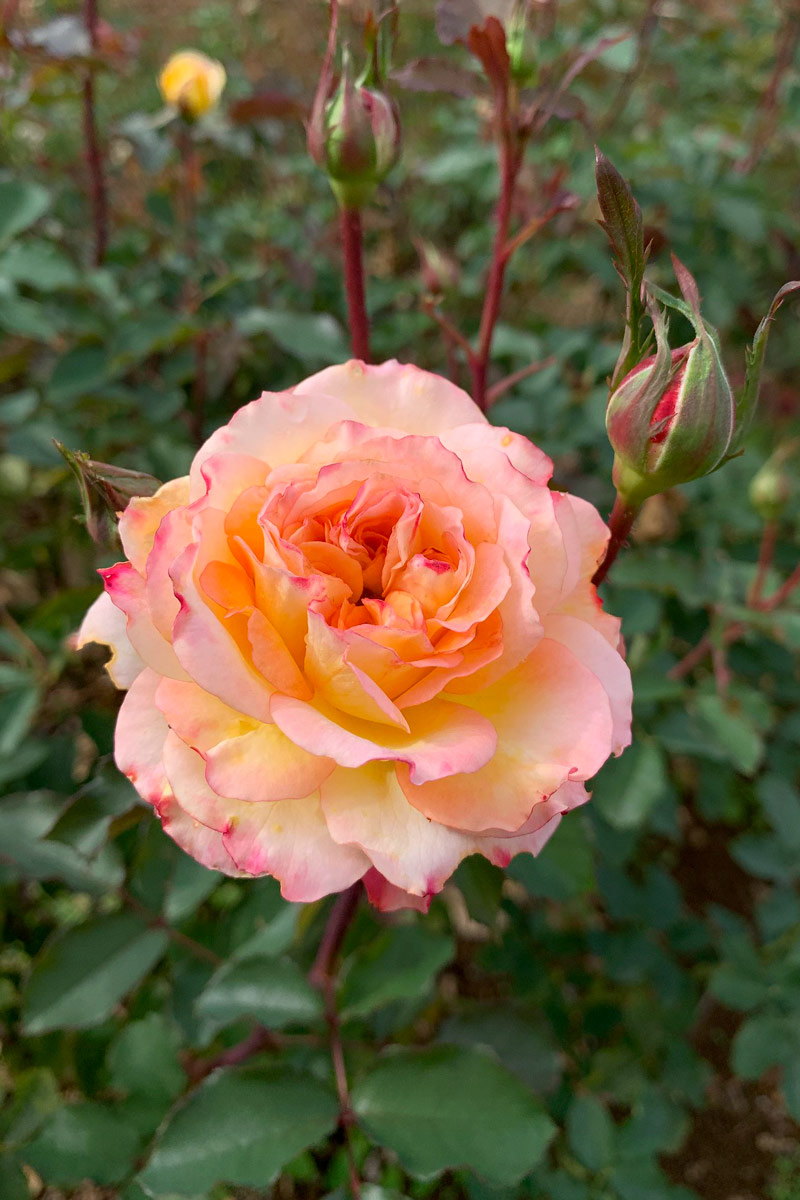 中心が濃いアプリコットから黄色・クリーム色になり、弁端はピンクの覆色でとても可愛らしい配色で目を引きます。花弁が多く中輪の浅いロゼット咲きで、アンティークな雰囲気も漂います。愛らしくロマンチックです。