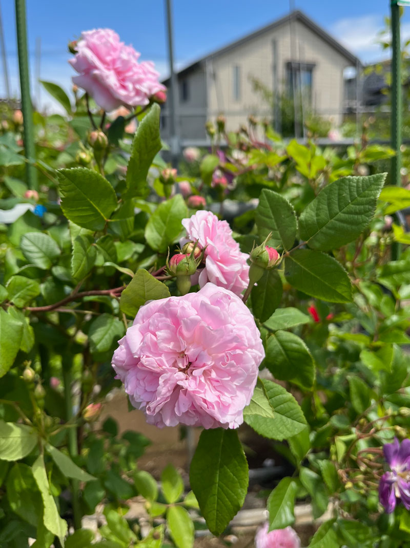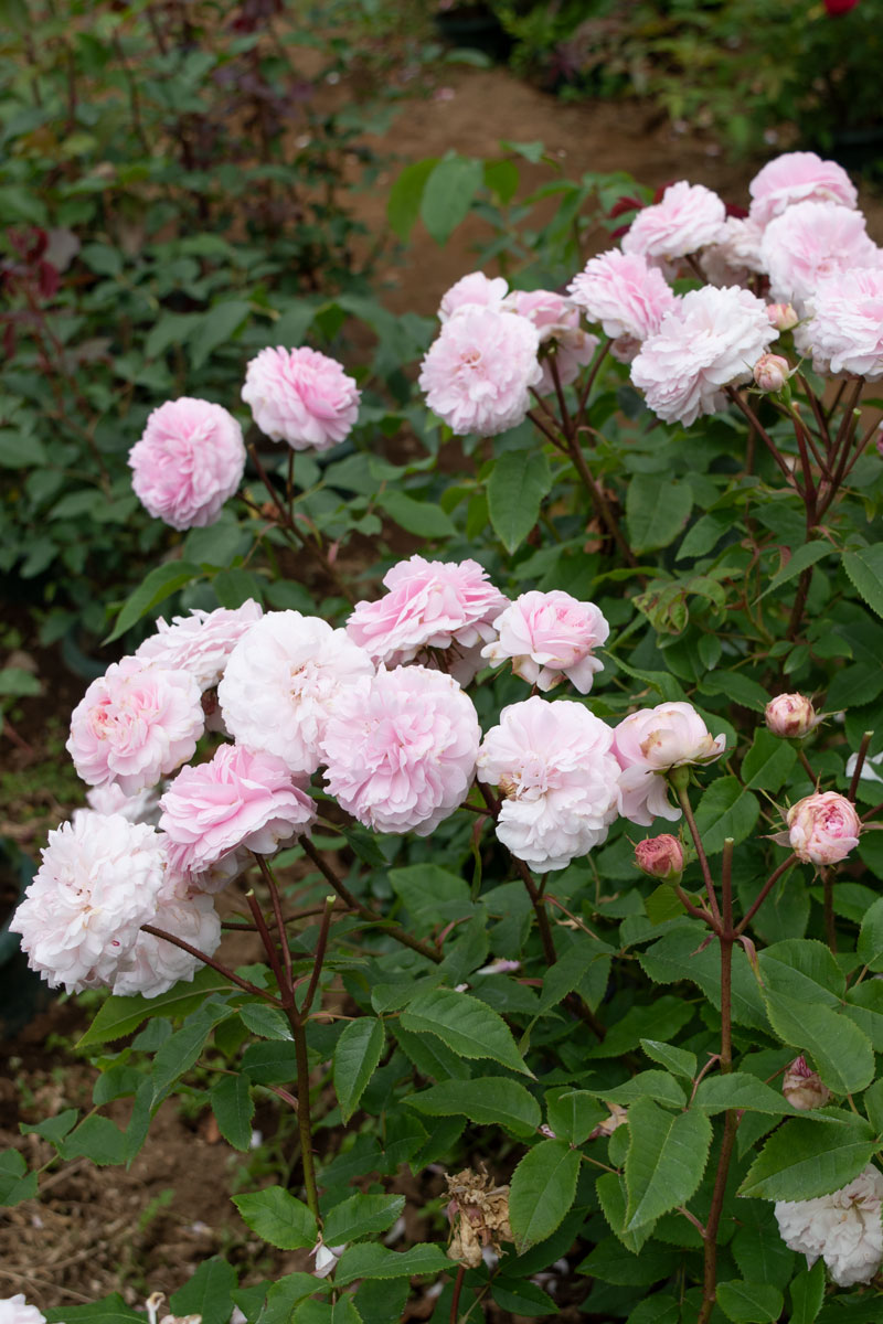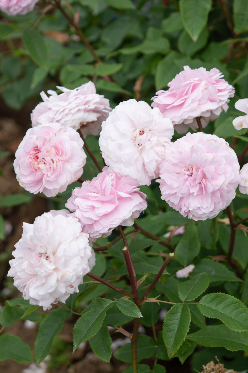 ジャックカルティエのつる性品種。カップ咲きからロゼット咲きになり、花首が短く、花が直接葉の上に乗っているように可愛らしく咲きます。枝も良く伸び、棘も少ないので誘引も行いやすいです。香りも良い、大変美しいバラです。