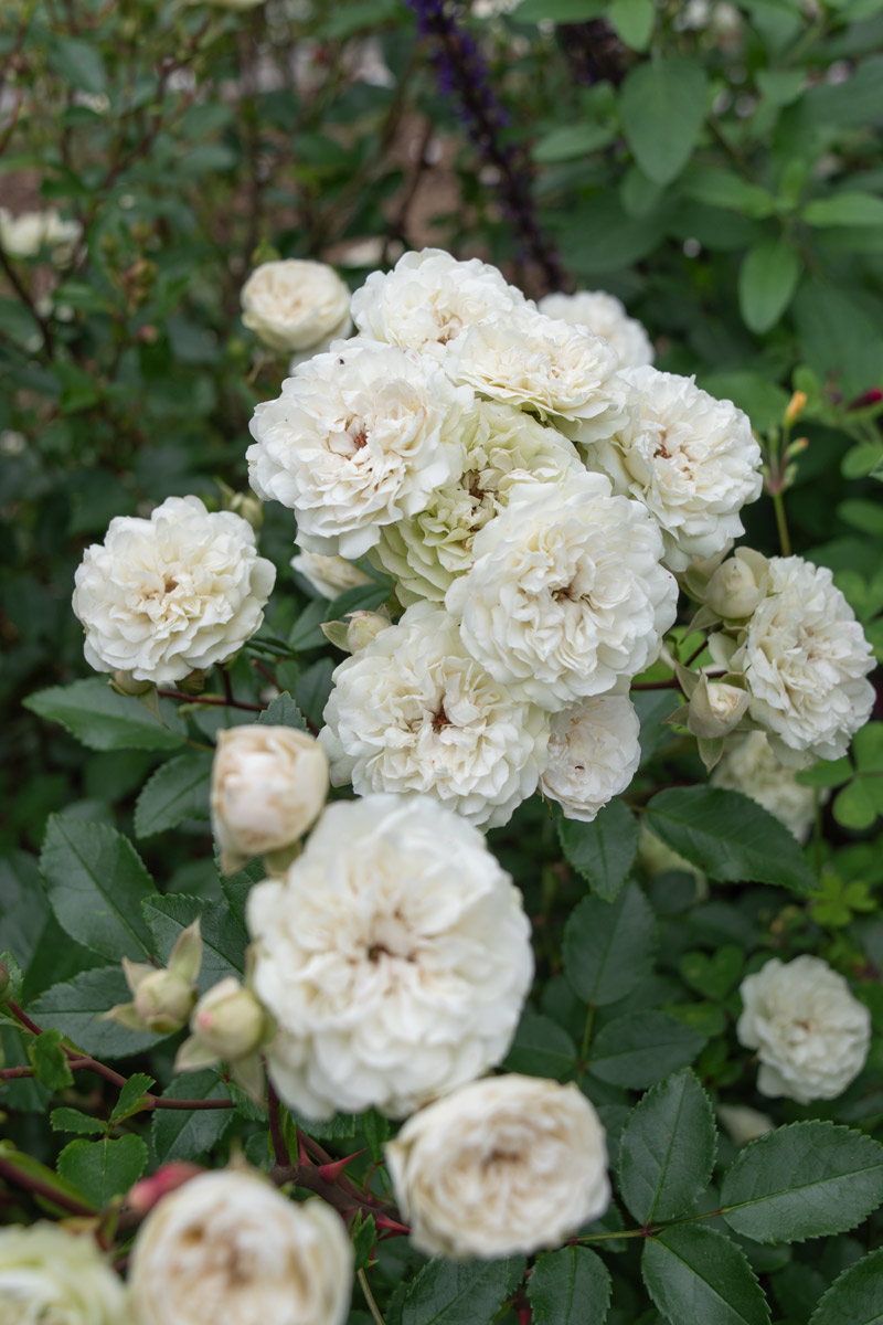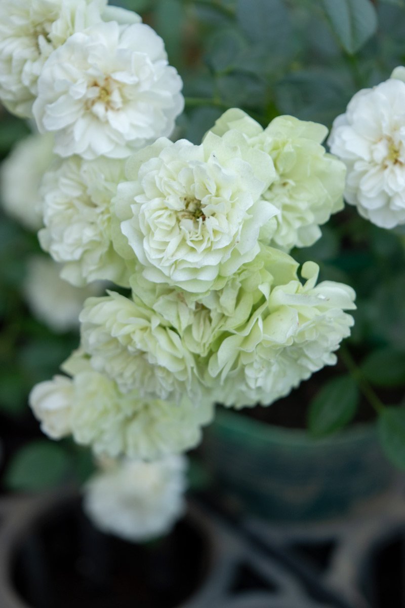 ボタンアイを持つロゼット咲きの白花がやがて緑色に変化していきます。花もちはとても良いです。テリハノイバラの血を受け継ぎ、高い耐病性を持ちあわせています。樹性は横張り性で、大株・大房に生育すると下垂するので、グラウンドカバーや、ハンギングに仕立てると楽しめます。