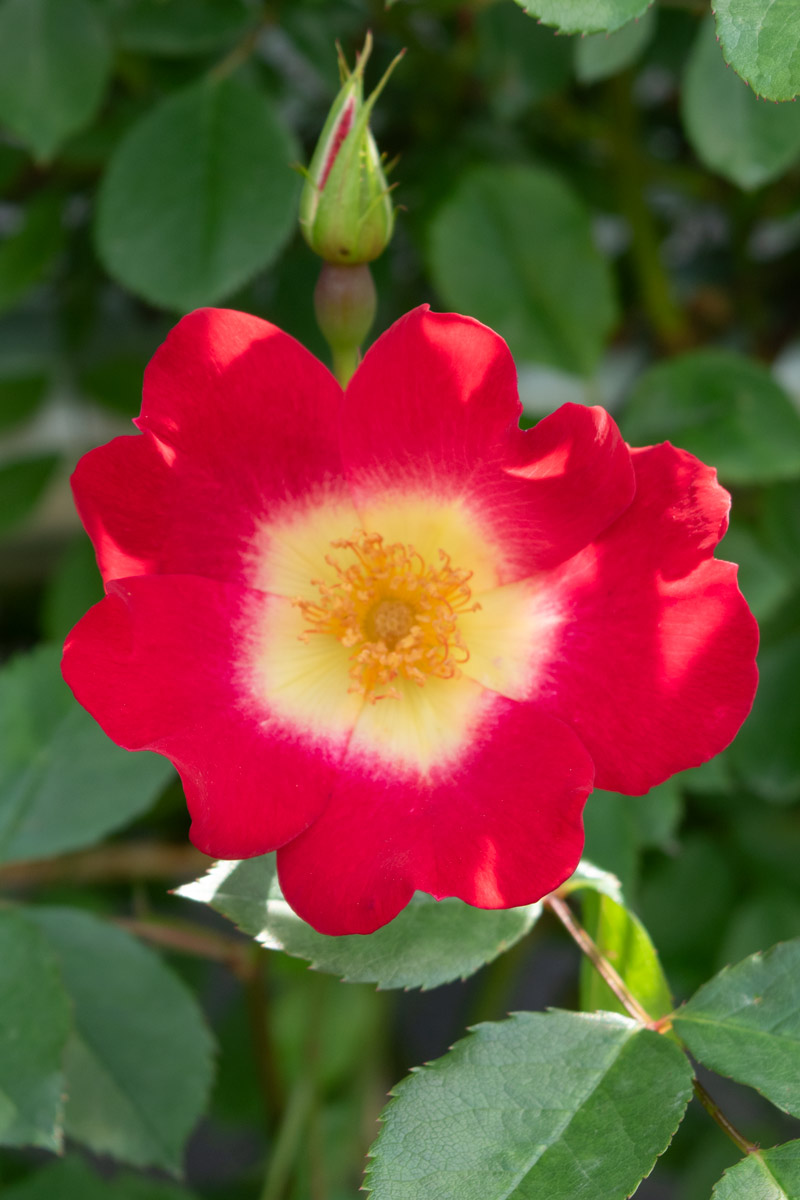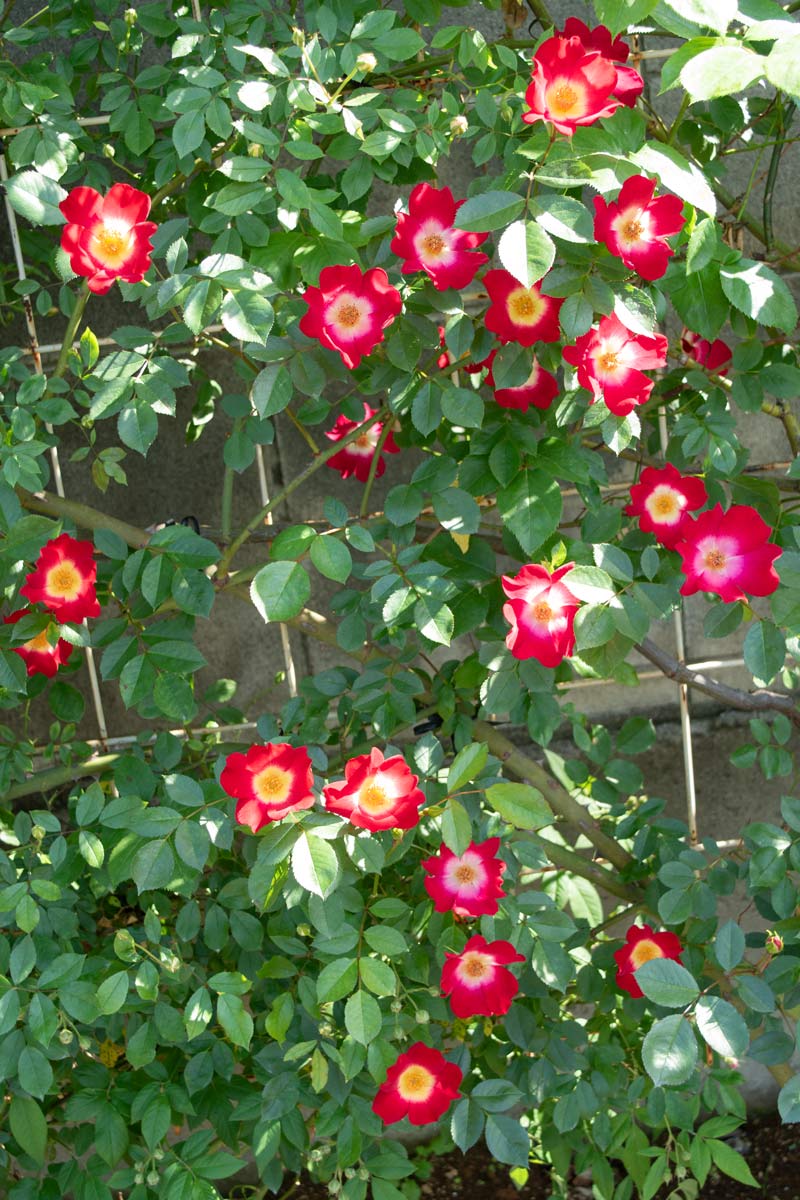 花弁数5枚の一重の中輪咲きで、非常に優秀なつるバラです。広いスペースを覆えるほど伸び、早咲きで繰り返しよく咲き、花色の変化する華麗な美しさと花付きの良さで人気が高い品種です。花芯部の色は白~黄色を示しますが、黄色が強く出たときの赤色とのコントラストはため息がこぼれる程です。一般的につるバラとして扱われていますが、シュラブに分類されており、切り詰めて大鉢で育てることもできます。作出者は名花ピースと同じ、フランシス・メイアン。フランスの名女優ロミー・シュナイダーに捧げられました。2015年、第17回世界国際バラ会議フランス・リヨン大会にて「バラの栄誉の殿堂」入りを果たします。別名:コクテール
