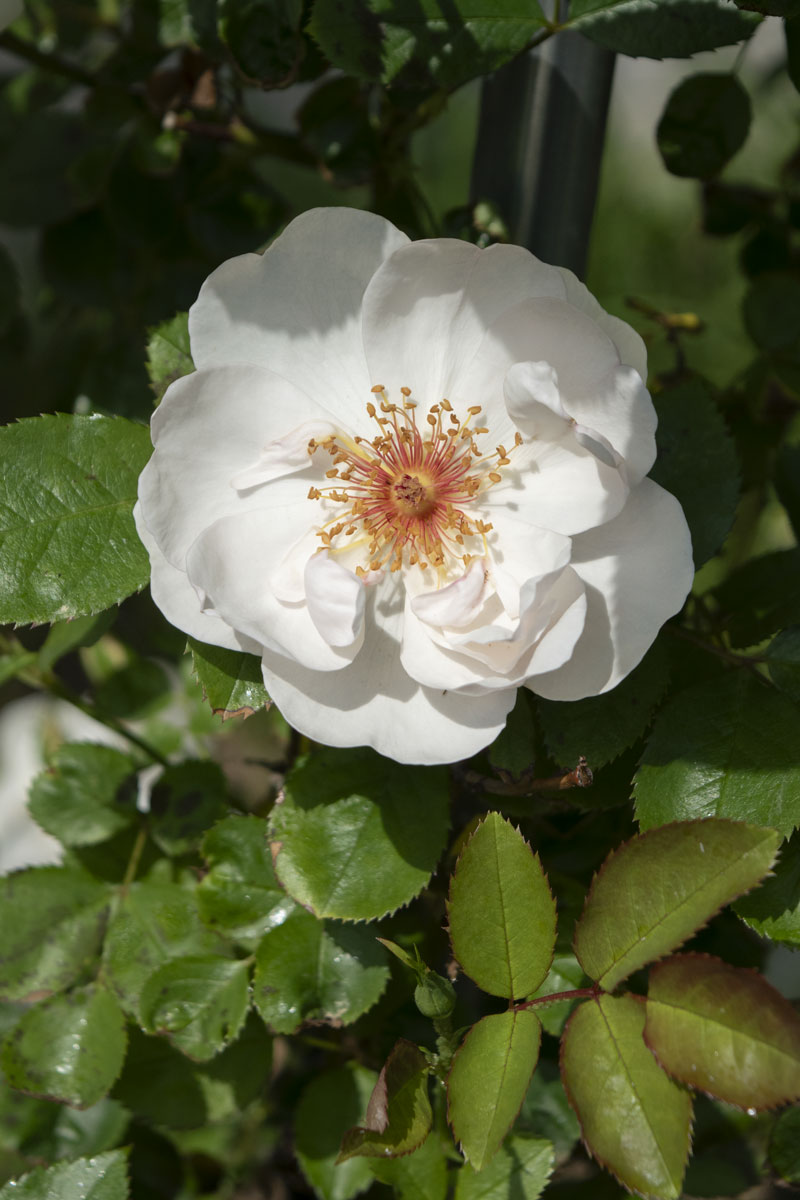 花芯のピンクの蕊(しべ)とのコントラストが美しく、繊細な雰囲気を持つ花です。春の早い時期から多くの花をつけます。細めの枝を伸ばして壁や支柱に誘引ができますし、短めに切り詰めて、木立性としても仕立てられます。花名は夭折した天才チェロ奏者の名にちなんでつけられました。